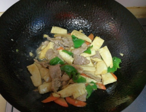 4、将蒜碎放入锅中;翻炒至猪肉片变色出香味后放入胡萝卜片;将青椒放入锅中,将冬笋片放入锅中,根据自己口味放入适量蚝油;翻炒一会,将蚝油和食材混合均匀。