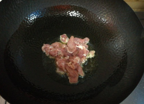 3、炒锅中放入适量调和油,油热后将猪肉片放入锅中。