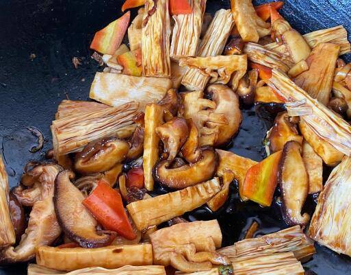 7、倒入腐竹、冬笋、胡萝卜、生抽、蚝油、老抽、糖翻炒均匀。