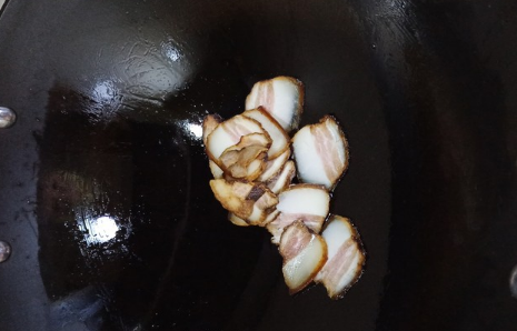 2、炒锅放入一点点的油,煸出腊肉里的油。