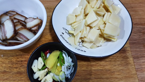 三、腊肉焖冬笋。1、准备食材:腊肉60克、冬笋160克、葱姜蒜适量、青红辣椒适量、盐适量、水适量。
