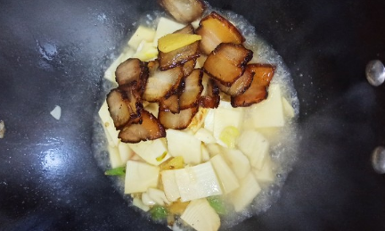 4、下冬笋片翻炒均匀,调入适量的食盐。加入没过笋片的水,下入腊肉片翻炒均匀,大火收干汁水即可。
