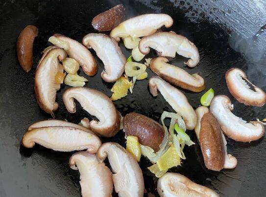 6、锅中倒油,7成热下葱姜蒜片爆出香味,再倒入香菇翻炒。