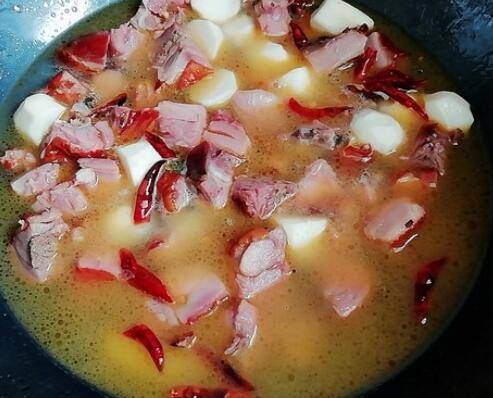3、起油锅,放入姜片和干辣椒煸香,放入腊鸭腿炒一会。