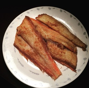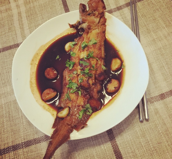 4、油烧味烧热,加蒜煎香,煎鱼(鱼用厨房纸擦干水),至金黄,加黄酒生抽老抽糖、清水,烧至鱼肉鱼骨可分离,装盘。