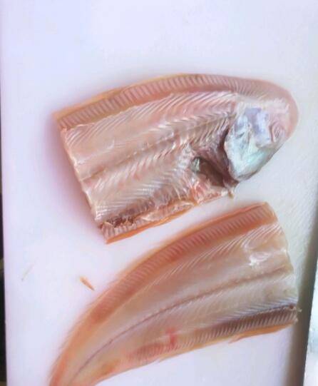 2、舌鳎鱼鱼皮撕掉,内脏清理干净,整鱼清洗干净后,把鱼对半切开。