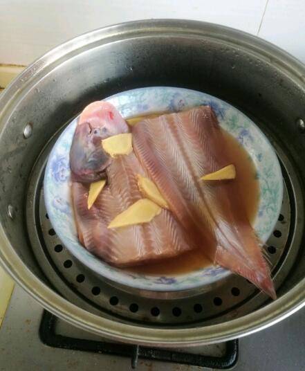 4、把鱼放入盘中,放入料酒,姜片。