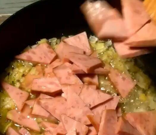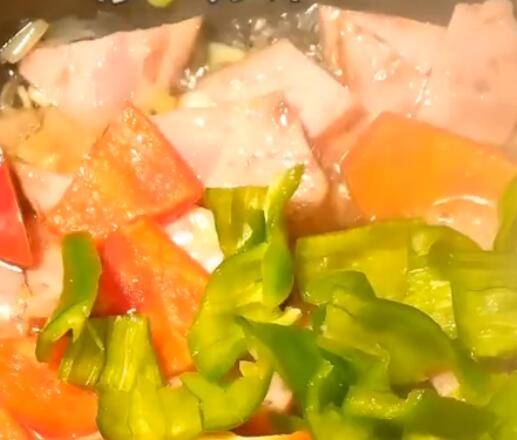 准备食材:火腿200克、青椒50克、红椒50克、葱、姜、蒜适量、料酒10克、白糖5克、盐2克、鸡精2克。