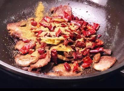 将肉片煎至两面焦黄,倒入干辣椒翻炒。