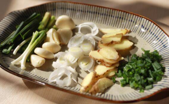1、首先分别将蒜叶,大蒜,大葱,姜,香葱切好装盘,备用。