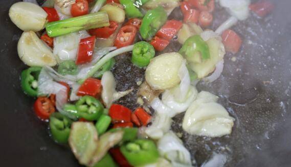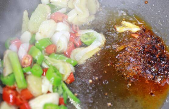 3、起锅烧油,将备好的配料下入锅中,爆出香味。