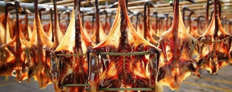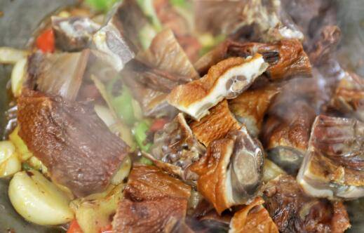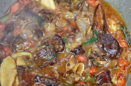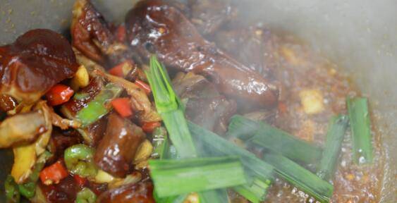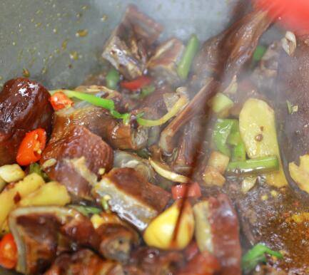 5、随后下入腊鸭,倒入料酒,翻炒均匀。