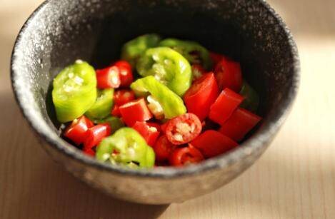 2、将红辣椒,青辣椒,小米椒切好装盘备用。