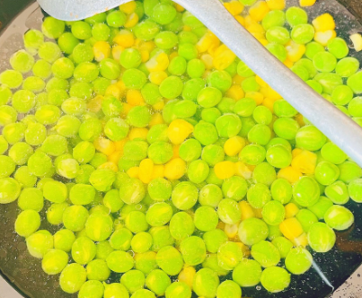 牛肉切丁腌制蚝油少许盐淀粉拌匀,豌豆玉米粒焯水一分钟。