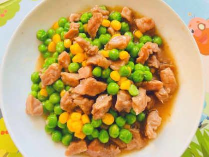 三、豌豆炒牛肉丁:豌豆150g、玉米粒50g、牛肉丁200克、盐少许、鸡精少许、水淀粉适量、香油少许、橄榄油适量。