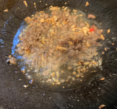 倒入豆瓣酱糊继续煸炒片刻,倒入牛肉,一起煸炒。