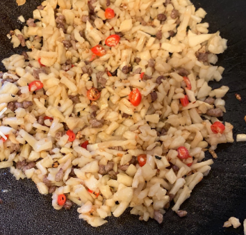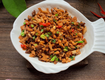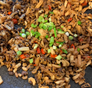 二、萝卜干炒牛肉丁:萝卜干170g、牛肉70g、蒜头4瓣、小米辣4颗、小葱2根、黑芝麻少许、老抽少许、生抽少许、黄酒少许、油适量、鸡精少许。