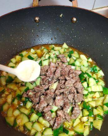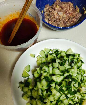 黄瓜切丁,牛肉逆着纹路切丁用玉米淀粉、生姜腌制。取小碗,放入水、豆瓣酱、生抽拌均匀备用。