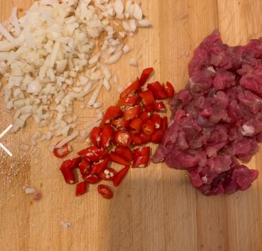 萝卜干切丁,牛肉切粒,小米辣蒜头切好备用。