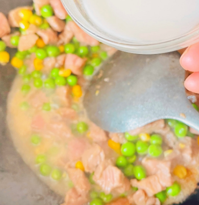 加油先炒牛肉丁然后放豌豆和玉米粒,加少许盐鸡精淀粉勾芡。