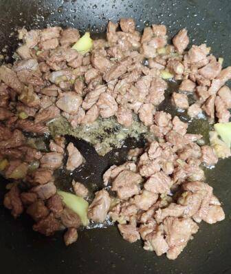 锅烧热倒入适量的油烧热,牛肉粒和蒜末放入爆香。