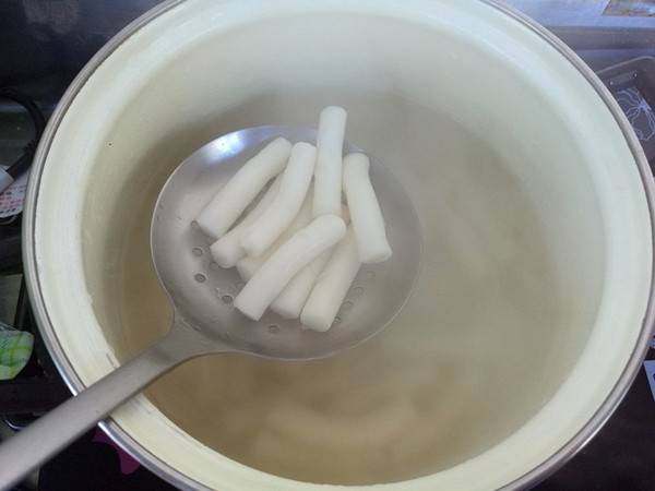 1、锅中放水烧开,把年糕条放进锅里焯烫2分钟,捞出来过冷水。