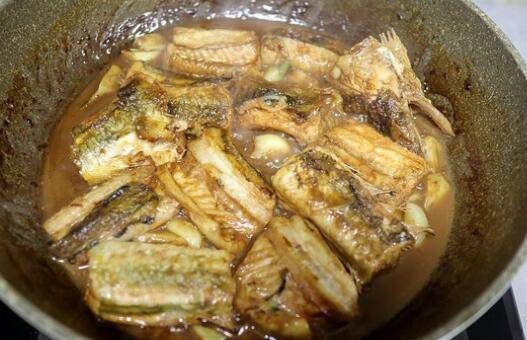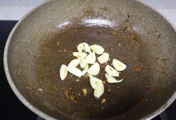 8、将两面煎得微焦的鱼块夹出来,用底油将蒜瓣煸炒出香味。