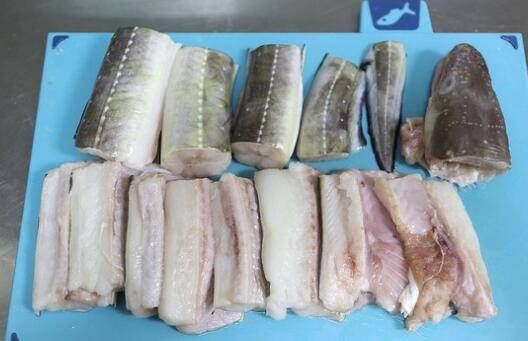 5、用利刀将鳗鱼切割成长短相等的鱼段,中间被剖开的鱼身贴着一边脊椎骨切成两块,这样入锅后好翻身且不占地。