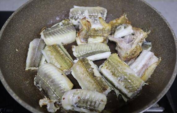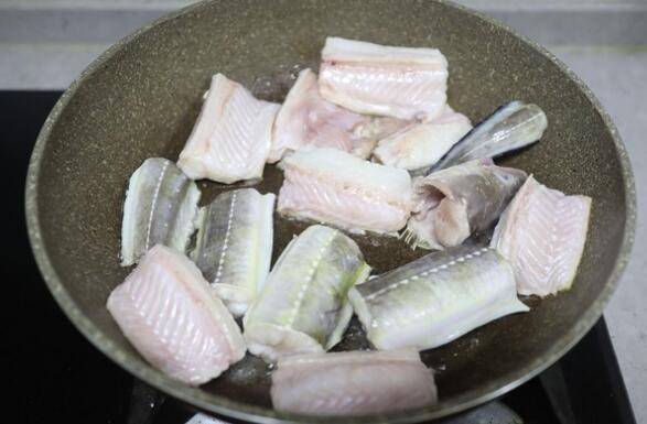 6、平底煎锅中倒适量油,油温6、7成热时,将鱼段码放在锅里,先不要翻动,中小火加热,待底部煎得微焦时再翻身。
