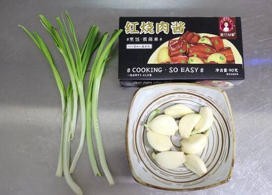 2、调味料准备好几棵小葱、一头大蒜、一盒红烧肉酱即可;没有这个酱可用适量酱油、生抽、红豆腐乳酱汁、盐、少许白糖等代替。