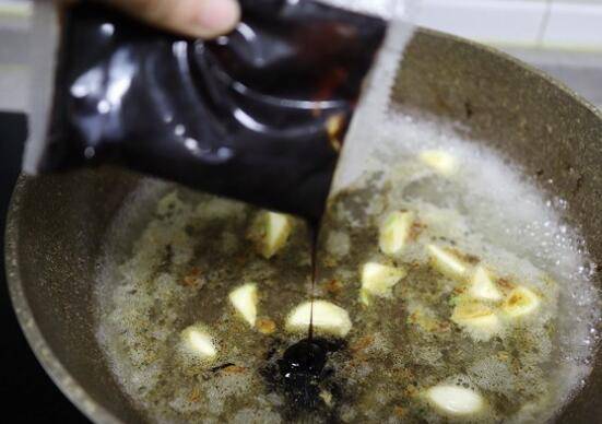 9、倒一碗热水,激发出蒜香,再将适量红烧肉酱汁挤入汤中。