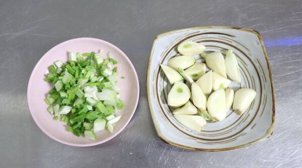 3、小葱切末,大蒜切块。