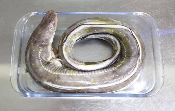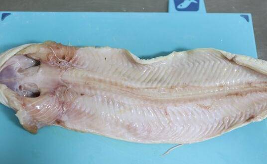 4、将鳗鱼仰面放在案板上,贴着骨头的血和腹内也一并冲洗干净。