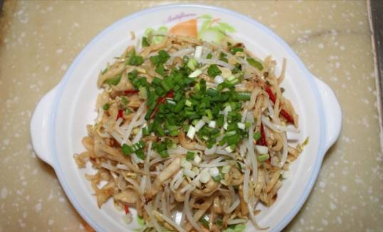2、锅中倒油,油烧热,炸香花椒后捞出,下入豆芽菜、青椒煸炒。