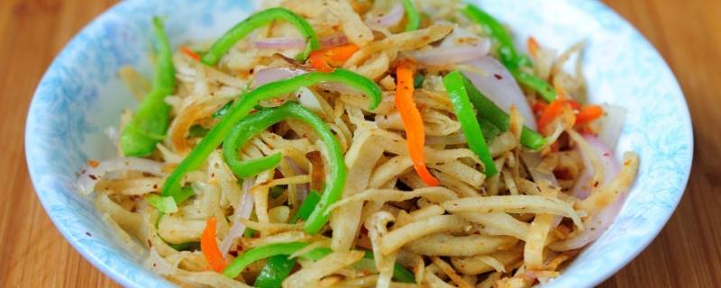 4、下入饼丝,翻炒2分钟后起锅装盘,撒上香葱碎即可食用。