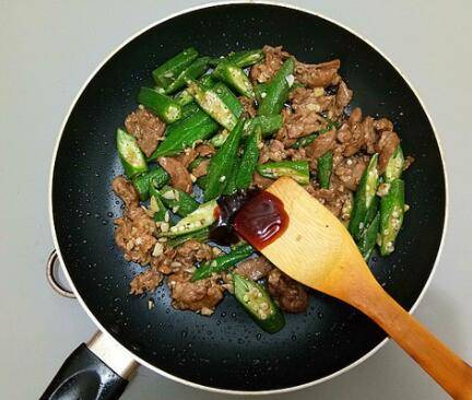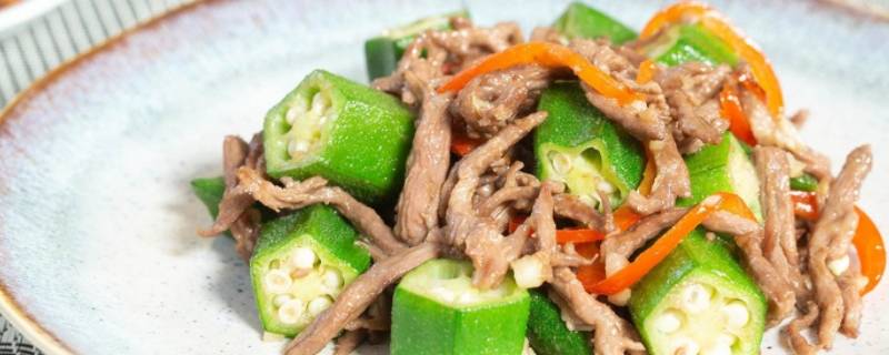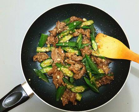 用料:牛肉150克、秋葵150克、黑胡椒酱2茶匙、蚝油适量、料酒1茶匙、食盐少许、大蒜4瓣。