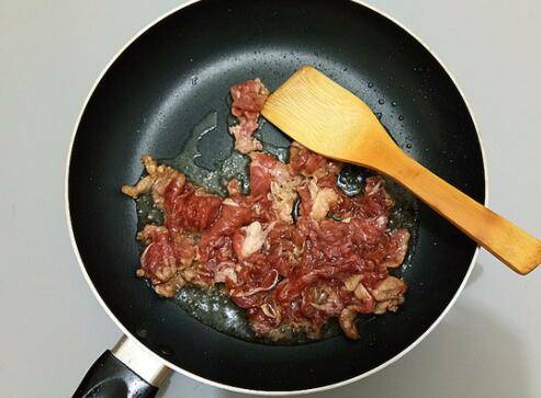 5、热锅放油,油温六成热放入腌制好的牛肉滑炒。