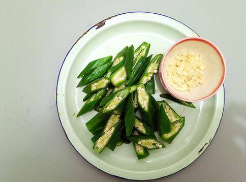 4、焯过水的秋葵斜着切成小段,大蒜切末备用。