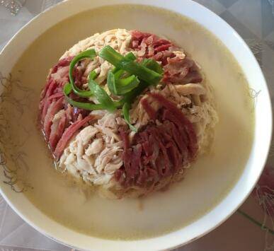 鸡胸脯肉煮熟,用鸡架吊汤,切两片火腿一起吊汤,将火腿放到水里煮五分钟。