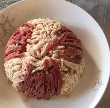 三种材料分别切丝码放在碗里面,上锅蒸十五分钟,拿出倒扣在盘子里。