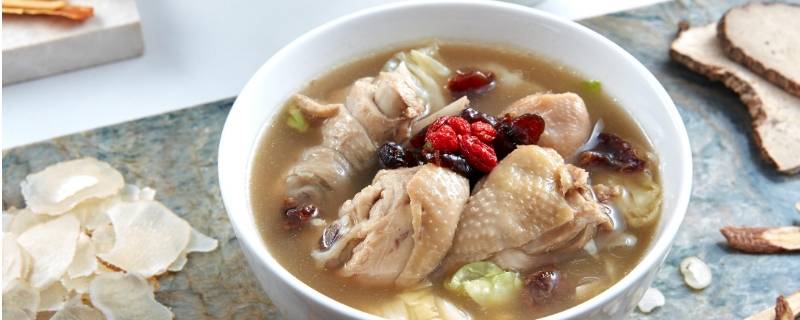 用料:土鸡1只、姜5克、葱5克、桂圆2个、红枣2个、黄芪3克、白芍2克、党参3克、当归2克、枸杞5克、盐2克。