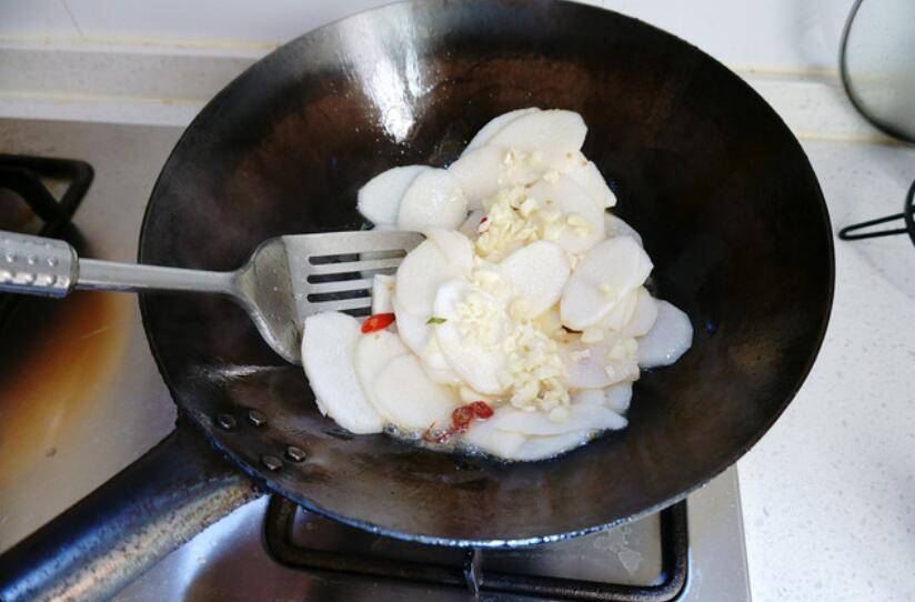 7、等山药片变透明后撒入蒜粒翻炒均匀即可出锅。