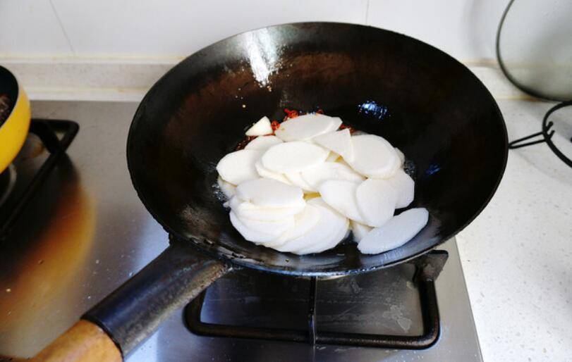 5、锅里倒入适量花生油放辣椒炒香后倒进山药片。