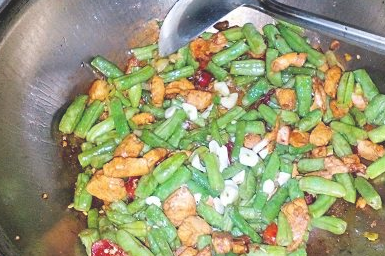 倒入豆角丁、加盐、十三香,鸡精调味并翻炒均匀;