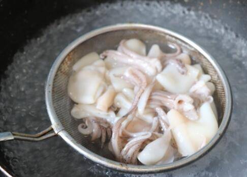 4、锅中水烧开,下入鱿鱼块,焯水5秒钟捞出。