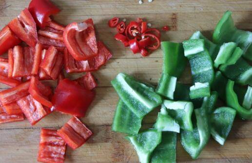 1、准备好所需要的食材并清洗干净,青红椒切小块备用。