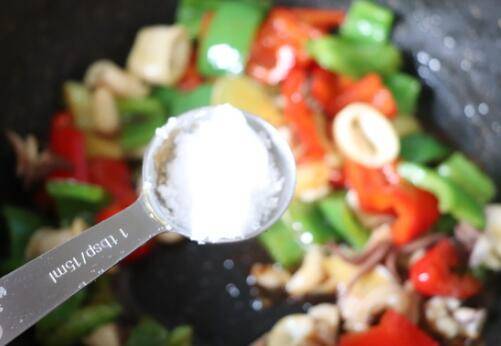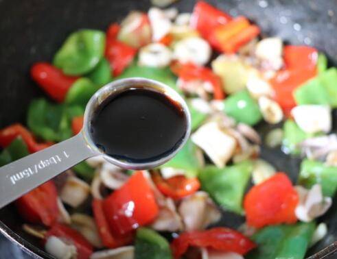 6、青红椒炒到断生后下加入鱿鱼块翻炒,加入一大勺蚝油,再加入一大勺酱油翻炒。