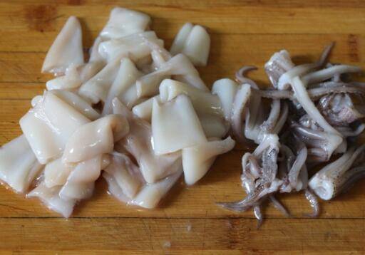 2、鱿鱼去除内脏,剪去眼睛,撕掉鱿鱼皮,再次冲洗一下,切成小块备用。