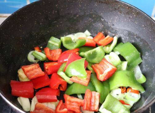 5、热锅凉油,下入葱姜蒜爆出香味,下入青红椒块翻炒。