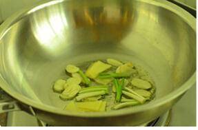 锅内放油,将姜、葱、蒜放入爆香;然后放入花蟹翻炒至变色。
